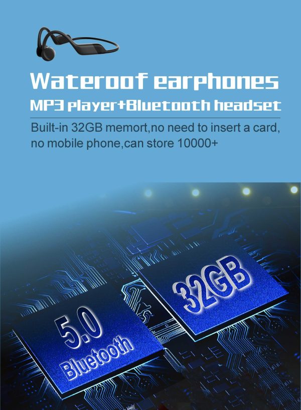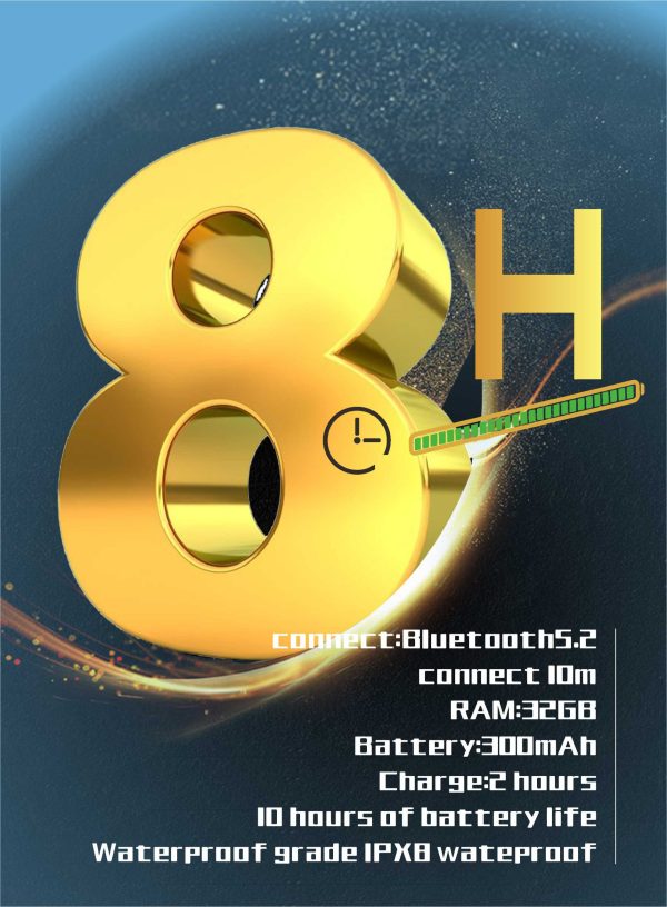 Horn: Bone conduction Playback time: Approximately 10 hours Call duration: approximately 10 hours Standby time: approximately 500 hours Charging time: Approximately 1.5 hours Function :IP68 waterproof, with 32GB of built-in memory